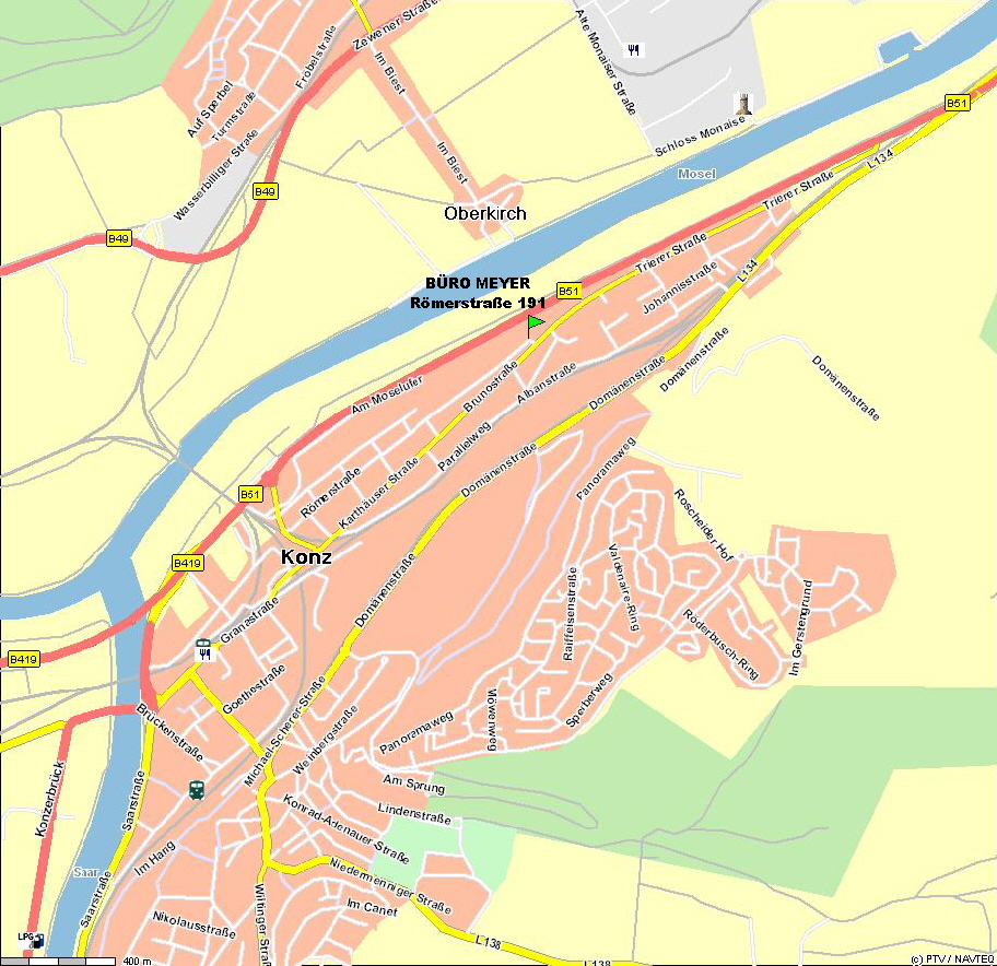 WEGBESCHREIBUNGEN Wenn Sie von TRIER zu uns fahren: Ab dem Verteilerkreis (Autobahnausfahrt A602) an der Mosel vorbei a Zurmaiener Straße a Ascoli Piceno Straße a Martinsufer a Katharinenufer a Johanniterufer a Sankt Barbara Ufer a Pacelliufer auf B51 (linke Spur) a über Brücke, dann links abbiegen und nach Konz einfahren auf der Triererstraße a Brunostraße a dann 1. Straße rechts in die Römerstraße abbiegen und bei der Hausnummer 191 direkt in der Kurve haben Sie Ihr Ziel erreicht.